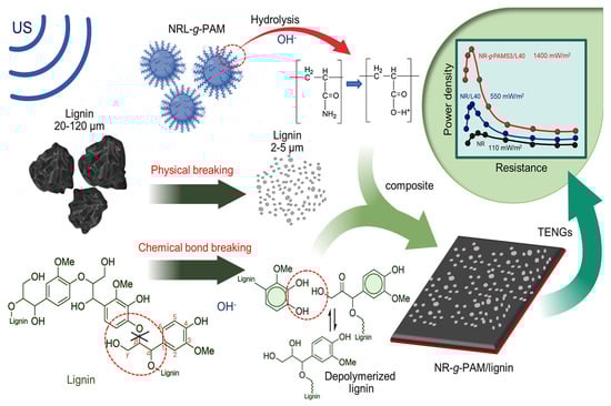 - Nanthagal, K.; Khoonsap, S.; Harnchana, V.; Suphasorn, P.; Chanlek, N.; Sinthiptharakoon, K.; Lapawae, K.; Amnuaypanich, S. Unprecedented Triboelectric Effect of Lignin on Enhancing the Electrical Outputs of Natural-Rubber-Based Triboelectric Nanogenerators (TENGs). ACS Sustain. Chem. Eng. 2023, 11, 1311–1323. [Google Scholar] [CrossRef]