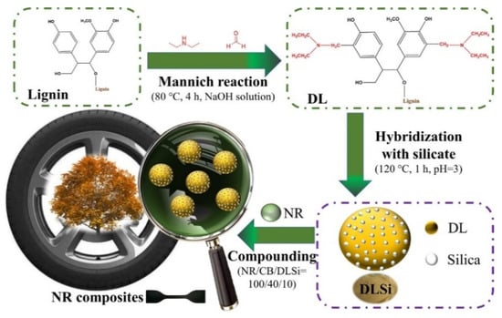 - Qiu, J.; Yuan, S.; Xiao, H.; Liu, J.; Shen, T.; Tan, Z.; Zhuang, W.; Ying, H.; Li, M.; Zhu, C. Study on lignin amination for lignin/SiO2 nano-hybrids towards sustainable natural rubber composites. Int. J. Biol. Macromol. 2023, 233, 123547. [Google Scholar] [CrossRef]