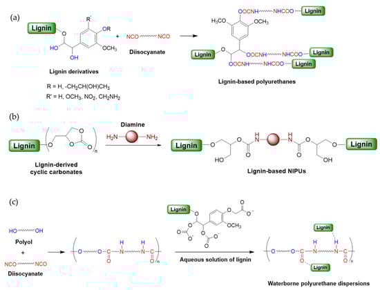 General reaction scheme for lignin-based polyurethane formation. (a) Traditional isocyanate pathway from unmodified or modified lignin (b) Non-isocyanate pathway from cyclic carbonate functionalized lignin and amines (c) Waterborne polyurethane synthesis pathway from auqeous solution of lignin.