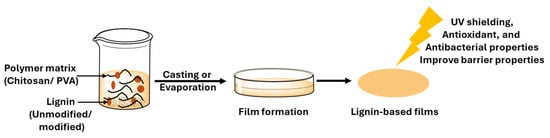 - Pham, C.D.; Truong, T.M.; Ly, T.B.; Le, P.K. Application of Lignin from Cellulose Isolation Process in the Fabrication of Chitosan/Lignin Film for UV-Light Blocking and Anti-oxidation. Waste Biomass Valorization 2023, 15, 1881–1894. [Google Scholar] [CrossRef]