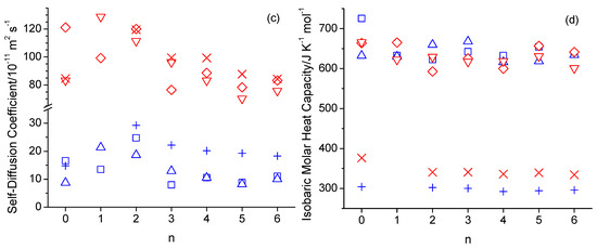 Density (a),viscosity (b), self-diffusion coefficient (c), and isobaric molar heat capacity (d) as a function of the integer number of carbon atoms between the hydroxy and ether groups (n) in n-octanol-related ether alcohols, where n = 0 refers to n-octanol, simulated with the OPLS-AA force field at 298 K (blue square) and 358 K (red diamond), with the CHARMM force field at 298 K (blue up-triangle) and 358 K (red down-triangle), and measured experimentally [1,51] at 298 K (blue plus) and 358 K (red cross).