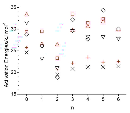 Arrhenius activation energies as a function of the integer number of carbon atoms between the hydroxy and ether groups (n) in n-octanol-related ether alcohols, where n = 0 refers to n-octanol for viscosity (black-colored cross, diamond and down triangle for the experiment [1], simulation with the OPLS-AA force field, and simulation with the CHARMM force field) and self-diffusion (red-colored plus, square, and upside triangle for the experiment [1], simulation with the OPLS-AA force field, and simulation with the CHARMM force field).