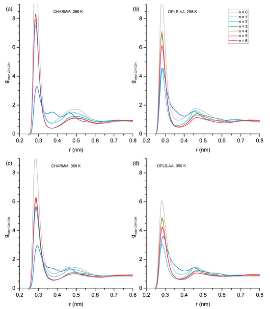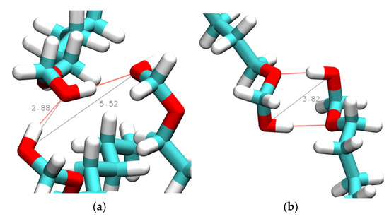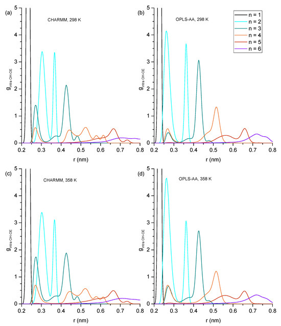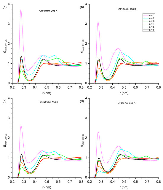 Aside from the 0.29 nm peak, a broad peak is consistently present for distances between 0.45 and 0.50 nm. The snapshot in Figure 10a illustrates that this broad feature corresponds to the O[1]-O[3] distance in a hydrogen bond triplet, where O[3] represents an OE, and O[1]/O[2] are OH oxygen atoms, which is a similar arrangement as in Figure 7a for a hydrogen bond triplet of three OH groups. For n = 2, there is another peak near 0.55 nm in the ginter,OH-OE graphs in Figure 9, which is more prominent for the results from simulations with the CHARMM force field. This peak is a result from the double hydroxy–ether hydrogen-bonded dimers that are compared to n = 1, being reduced but still significantly present for n = 2, as discussed above for Figure 6, Figure 7 and Figure 8. A side effect of OH-OH hydrogen bonding between two ether alcohols is that the ether group of one ether alcohol is coming into a more well-defined position relative to the OH of the other ether alcohol. This gives rise to additional peaks in some of the ginter,OH-OE graphs in Figure 9. Specifically, Figure 10b,d show structures that, respectively, explain the broad peak below 6 nm for CHARMM simulations with n = 3, the broad feature for CHARMM simulations with n = 4, and the relatively sharp feature for OPLS-AA simulations with n = 3. Finally, all peaks in the ginter,OH-OE graphs in Figure 9 are reduced in intensity at the higher temperature of 358 K, where the reduction is most notable for the 0.29 nm peak. This observation is readily explained by an overall reduction in intermolecular hydrogen bonding at higher temperatures due to the increased kinetic energy present for the molecules in the system.