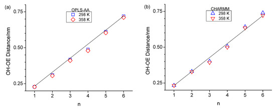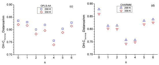 The formation of the ring-like intramolecular hydrogen bonding structures should lead to decreased average OH-OE as well as OH-Cterminal distances. This is, to a certain extent, supported when inspecting these two types of atom-to-atom distances in Figure 5. Specifically, the OH-OE distances deviate the most from an approximate linear trend in Figure 5a,b for n = 3 for CHARMM, as well as n = 4 for both CHARMM and OPLS-AA, and in Figure 5c,d the OH-Cterminal distances are lowest in value for n = 3 and n = 4. These observations agree with the RDFs in Figure 3 with respect to the intramolecular hydrogen bonding peak at 0.28 nm.