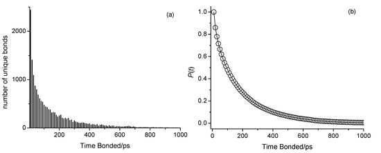 (a) Histogram showing the number of unique bonds as a function of time spent bonded in ps, regardless of continuity, within a 5000 ps window for the 298 K CHARMM simulation of n-octanol. (b) Complementary cumulative distribution function (CCDF), P(t), as a function of time spent bonded in ps.