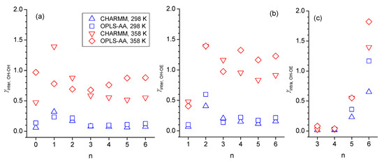 Moving on from discussing the structural aspects of the intra- and intermolecular hydrogen-bonded species, this section focuses on the quantitative comparison of the types of hydrogen bonding interactions. Figure 11 shows bar graphs of average number of hydrogen bonds, differentiating between the three major categories of intermolecular OH-OH and OH-OE bonds and intramolecular OH-OE bonds. Many of the trends discussed in Section 3.2 and Section 3.3 about the various RDFs are confirmed in Figure 11. Intramolecular hydrogen bonding is significantly present only for n = 3 and n = 4, where the CHARMM force field predicts more intramolecular hydrogen bonding for n = 3, while the OPLS-AA force field predicts that to be the case for n = 4. The very large presence of intermolecular hydroxy–ether hydrogen bonding for n = 1 is a result of the formation of the double-hydrogen-bonded dimer ring structure. Higher temperatures reduce the intermolecular hydrogen bonding interactions but slightly increase the intramolecular hydrogen bonding interactions. As pointed out in Section 3.1., the largest disagreement between the two force fields in predicting physical properties is observed for n = 2. Figure 11 shows that this difference is likely a result in the different simulation outcomes for hydrogen bonding. While both force fields indicate an absence of intramolecular hydrogen bonding, simulations with the OPLS-AA force field result in about 30% lower numbers of intermolecular hydrogen bonds than simulations with the CHARMM force field. Hydrogen bonding numbers are also lower for n-octanol with the OPLS-AA force field but somewhat higher for n = 1. Overall, the total number of hydrogen bonds fluctuate less for the simulations with the CHARMM force fields, which might explain that the trends seen in Section 3.1 with respect to n in the physical properties from the CHARMM simulations are smoother than those from the OPLS-AA simulation.