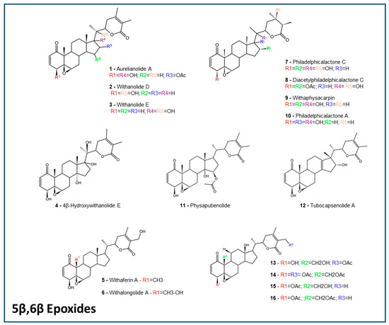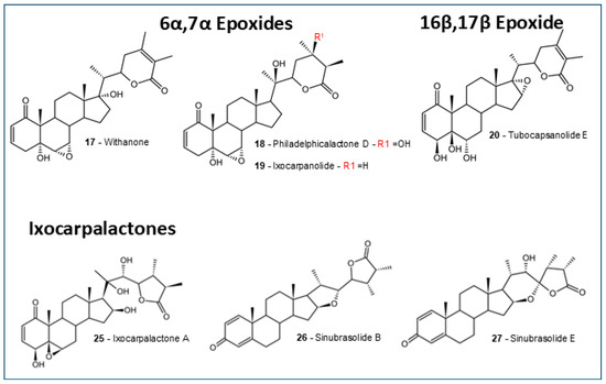 The 6α,7α epoxides, 16β,17β epoxides, and ixocarpalactones withanolides. The structures were designed using the software ACD/ChemSketch 2020.2.0 (ACD/Labs).