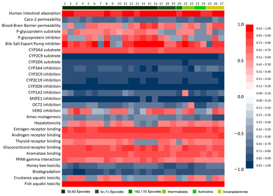 Heatmap constructed from admetSAR predictions. A total of 27 withanolides were assessed for their ADMET properties. Results range from 1.0 (+) to 1.0 (−), and were plotted following a color intensity scheme.