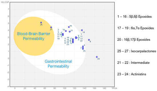 Chemotherapeutics are usually delivered via the parenteral route, with some exceptions, such as the imatinib mesylate, anastrozole, letrozole, and tamoxifen citrate, which were developed as oral drugs. Studies on the ability of withanolides to pass the gastrointestinal barrier may be useful for specific applications and pharmaceutical development. Among the tested withanolides in the BOILED-Egg prediction system, only 4β-Hydroxyanomanolide, Diacetylphiladelphicalactone C, and compound 14 would not be able to pass the gastrointestinal barrier (Figure 5), suggesting that most withanolides would be absorbed by the gastrointestinal system making them optimal candidates for oral administration to patients, an advantage that usually increases the adherence to the treatment.