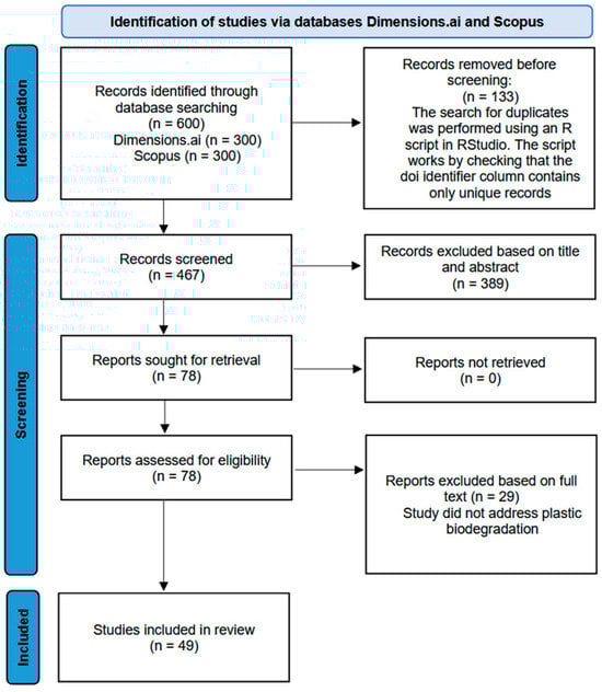 The methodology used to identify predominant techniques for confirming plastic biodegradation involved a structured literature search conducted on the Scopus and Dimensions.ai databases. Only Open Access articles published in English were considered. Specific keywords, including “microplastic biodegradation organism”, “microplastic biodegradation microbes”, and “plastic biodegradation” were employed for the search. Results were filtered by citation metrics and relevance. From each query, 50 results were retrieved, resulting in an initial dataset of 600 articles. Duplicate entries were removed, reducing the dataset to 467 articles. Titles and abstracts were then reviewed in the first stage of selection, narrowing the dataset to 78 articles. After a detailed review of the full texts, the methods used for confirming biodegradation were extracted from 49 articles to determine the most frequently employed techniques. Figure 1 presents a workflow applied to retrieve articles relevant to the determination of the most frequently used techniques to confirm biodegradation. Figure 2 presents the distribution of the identified techniques based on their frequency of use in the studied articles.
