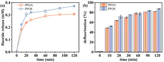 The effect of VUV irradiation time on the defluorination performance of PFOA and PFOS was investigated. As shown in Figure 1, both compounds exhibited progressive fluoride releases, reaching 0.307 mM (81.9%) for PFOA and 0.372 mM (87.5%) for PFOS after 120 min. Although the defluorination efficiencies between PFOA and PFOS were quite similar, there existed slight differences in fluoride release amount, which were attributed to the different numbers of fluorine atoms in the parent molecules. Rapid defluorination occurred within the first 30 min, followed by a slower stage, likely due to sulfite depletion and the increasing stability of residual C–F bonds [30]. As the reaction proceeds, increased resistance to reduction occurs in residual C-F bonds, which are often situated at sterically hindered or electronically stable positions characterized by high bond dissociation energies [26,31]. Although UV-ARPs can achieve complete PFAS degradation with sufficient treatment time, defluorination is often incomplete [30,32]. For example, Bentel et al. [33] reported that while PFOA and PFOS were fully degraded after 8 h and 48 h UV treatment, respectively, their defluorination efficiencies were similar at ~50% over 48 h. This discrepancy arises because degradation can produce short-chain intermediates that retain fluorine, limiting the detectable fluoride release amount [34].