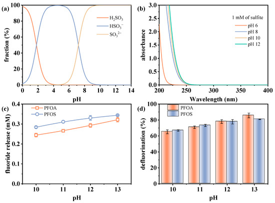 The initial pH of the reaction solution plays a critical role in determining sulfite species, and subsequently influences the defluorination efficiency of perfluorinated compounds in the VUV/sulfite system. The two pKa values of sulfite (1.8 and 7.2) [35,36] result in its predominant existence as a mixture of SO32− and HSO3− in the pH range of 4–9, while SO32− becomes the dominant species at pH values above 9 (Figure 2a). The absorbance of sulfite increases under higher pH conditions, as shown in Figure 2b, making it more susceptible to photoexcitation under irradiation. In a previous work, Luo et al. [36] estimated that SO32− has a higher quantum yield than HSO3− under photolysis at 266 nm (0.06 versus 0.01), with alkaline conditions conducive to enhancing the reaction efficiency.