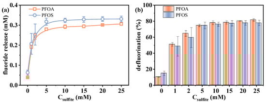As a key source of eaq−, sulfite generates a higher concentration of eaq− at elevated concentrations, thereby enhancing the reductive degradation process. The effect of varying sulfite concentrations (0–25 mM) on the defluorination performance was investigated. As shown in Figure 3, with the increase in sulfite concentration from 0 to 25 mM, the fluoride release amount of PFOA increased from 0.039 to 0.306 mM, and that of PFOS increased from 0.063 to 0.331 mM, corresponding to efficiencies of 10.3–81.7% and 14.8–77.9%, respectively.