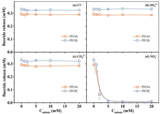 Changes in fluoride release amount in the presence of (a) Cl−, (b) SO42−, (c) CO32−, and (d) NO3−. Initial experimental conditions: [PFOA] = [PFOS] = 25 μM, [sulfite] = 20 mM, pH = 12, [Cl−] = [SO42−] = [CO32−] = [NO3−] = 0–20 mM, reaction time = 60 min.