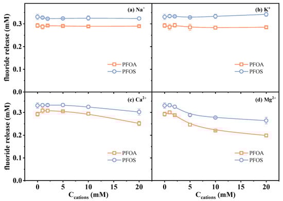 To assess the potential effect of common cations in an aqueous environment, four kinds of cations, including Na+, K+, Ca2+, and Mg2+, were selected. Experimental results under varying ion concentrations (0–20 mM) are presented in Figure 5. The results showed that Na+ and K+ had negligible effects on the fluoride release amount of both PFOA and PFOS in the investigated concentration range. These two monovalent cations are commonly used as inert counterions in ionic strength influence studies, owing to their high solubility and minimal direct involvement in redox processes [46,47].