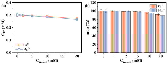 Effect of Ca2+ and Mg2+ on the determination of CF− using fluoride ion-selective electrode: (a) detected F− concentration and (b) F− recovery. Conditions: [F−] = 0.3 mM, [Ca2+] = [Mg2+] = 0–20 mM.