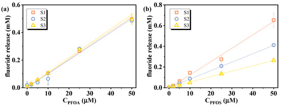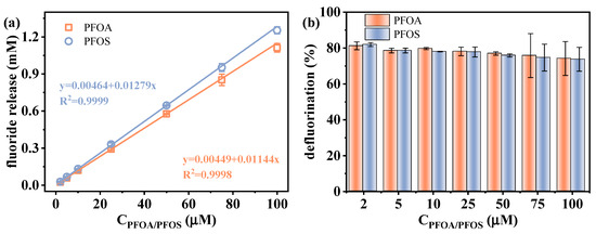 The feasibility of applying the VUV/sulfite system for the indirect quantification of individual PFAS via defluorination is investigated. The defluorination performance of PFOA and PFOS was examined under varying initial concentrations (2–100 μM). As shown in Figure 7, a strong linear correlation (R2 > 0.999) was observed between the fluoride release amount and initial PFAS concentrations, though there was a slight decrease in defluorination efficiency with increasing PFAS concentrations due to the fixed generation rate of eaq− under constant VUV/sulfite conditions. This indicates that, under sufficient sulfite dosage, the system is capable of achieving a stable response to various PFAS concentrations up to 100 μM. Such excellent linearity provides a solid foundation for indirect PFAS determination. The limit of detection (LOD) was calculated according to Equation (7):