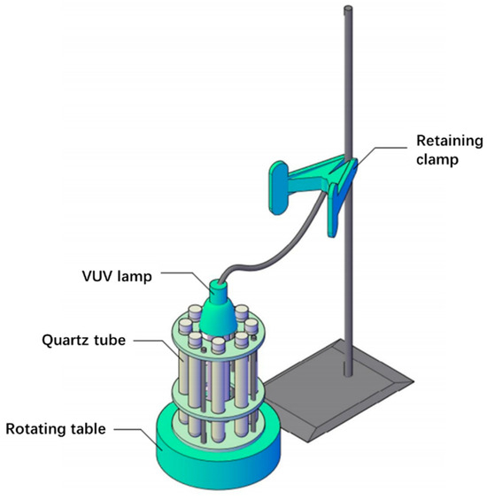 The structure of the reactor used in this work is shown in Figure 10. A VUV disinfection lamp containing light at 185 nm was used as the irradiation light source. A total of 8 quartz tubes were used as the reaction tubes, as quartz allows the penetration of the VUV light. A circular reaction rack was placed on the rotating table, and the VUV lamp was placed in the center of the reaction rack, with 8 quartz tubes evenly placed around the VUV lamp. In the light reaction process, the rotating table was turned on so that the quartz tubes rotated around the ultraviolet lamp to avoid reaction differences due to the light intensity. Each quartz tube was equipped with a PTFE plug to isolate the circulation of air inside and outside of the reaction tube.