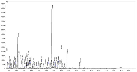 GC-MS analysis was performed on a Shimadzu GCMS-QP2010 Plus system (Shimadzu, Kyoto, Japan) equipped with an Equity-5 fused silica capillary column (30 m × 0.25 mm, 0.25 μm film thickness; Supelco, PA, USA) [26,27]. Helium was used as the carrier gas at a flow rate of 1.2 mL/min. Injector and interface temperatures were maintained at 280 °C. The oven was set to 60 °C (held for 2 min), increased to 240 °C at 3 °C/min (held for 10 min), then raised to 280 °C at 5 °C/min (held for 35 min). Samples (1.0 µL) were injected in split mode (30:1) at an inlet pressure of 93.2 kPa. Mass spectrometry conditions included an ionization voltage of 70 eV, a detector voltage of 0.80 kV, and a scan range of 40–500 amu at 0.5 scan/s. Retention indices (RIs) were calculated relative to a C7–C40 n-alkane series co-injected with the sample. Compounds were identified by comparing RI values with the literature data and mass spectra with NIST 11 and WILEY 7 libraries [28].