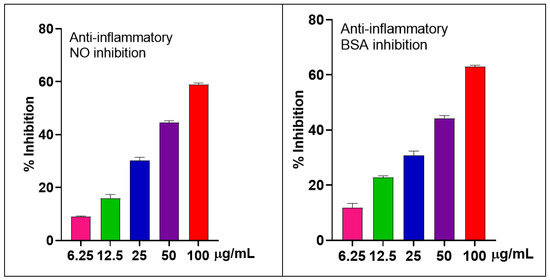 Regarding BSA inhibition, the pattern was similar to that of NO inhibition. It showed good properties with the IC50 value of 59.31 ± 0.71 µg/mL compared to the positive control diclofenac (IC50 ≈ 39.19 ± 1.44 µg/mL) (Figure 3).
