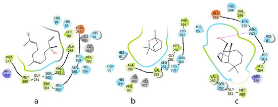 The EO showed good antioxidant and significant anti-inflammatory effects. Therefore, the main components such as (E)-nerolidol (16.1%) (a), 1,8-cineole (7.3%) (b), and iso-longifolol (5.8%) (c) in this EO were evaluated in silico for anti-tyrosinase and anti-inflammatory effects. Tyrosinase is an enzyme involved in melanin production, which can lead to pigmentation issues when overactive. Antioxidants can reduce oxidative stress, inhibit tyrosinase effects, and contribute to anti-inflammatory responses. Regarding the tyrosinase enzyme, a high binding energy indicates a stronger interaction between a–c and the protein. Three compounds, characterized by a lipophilic carbon framework, showed good energy ranging from −36.3 to −55.7 kcal/mol. Due to their specific chemical structures, the interactions between these three docked compounds and the protein binding site were primarily driven by hydrophobic interactions. Similarly, on the tyrosinase protein, compounds with an OH group (a and c) showed more favorable interactions with the binding site compared to b (Figure 5 and Table 2).