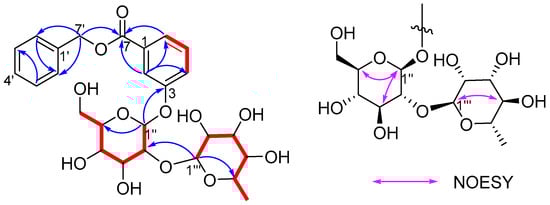 1H–1H COSY (red bold), HMBC (blue arrows), and NOESY correlations of compound 2.