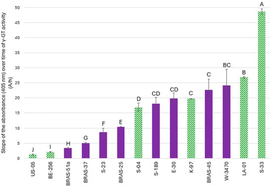 Slopes of the absorbance (405 nm) over time (A/h) for γ-GT activity in all the lager (full purple) and ale (dashed green) brewing yeasts tested. Values with different letters are significantly different (p < 0.05) according to the Student–Newman–Keuls test.