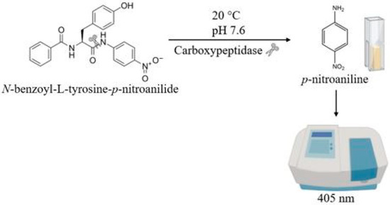 For the enzymatic assay, N-benzoyl-L-tyrosine-p-nitroanilide (NBTpNA) was used as a substrate, as in Ramirez-Zavala et al. [24] (Figure 3). Carboxypeptidase activity was assessed by measuring the increase in p-nitroaniline absorbance at 405 nm. The tests were carried out at 20 °C and pH 7.6. As mentioned above for γ-GT, because of the predominance of proteins other than carboxypeptidase in the enzymatic extract, we preferred not to translate our raw data (obtained for 108 cells/mL in 200 mL YPS medium) to specific activity. As a control, a commercial carboxypeptidase (Sigma-Aldrich: Saint Louis, MO, USA) was also tested.