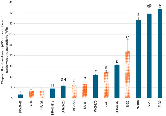 Slope of the absorbance (405 nm) over time (A/h) for carboxypeptidase activity in all the lager (full blue) and ale (dashed orange) yeasts tested. Values with different letters are significantly different (p < 0.05) according to the Student–Newman–Keuls test.