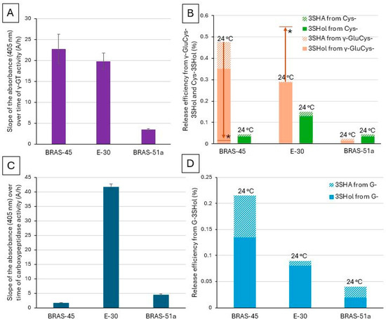(A) γ-GT activity—slope of the absorbance (405 nm) over time (A/h). (B) Efficiency (%) of free 3SHol (full) and 3SHA (dashed) release from γ-GluCys- (orange) and Cys- (green) precursors at 24 °C (or 12 °C *) (data previously published [19,20]). (C) Carboxypeptidase activity—slope of the absorbance (405 nm) over time (A/h). (D) Efficiency (%) of free 3SHol (full) and 3SHA (dashed) release at 24 °C from G- precursors (blue) (data previously published [19]). Each value is the mean of duplicate assays.