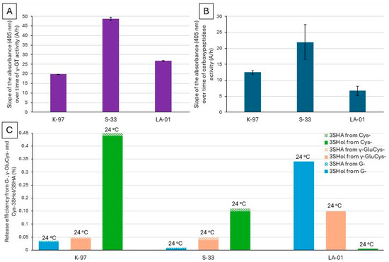 (A) γ-GT and (B) carboxypeptidase activity—slope of the absorbance (405 nm) over time (A/h). (C) Efficiency (%), at 24 °C, of free 3SHol (full) and 3SHA (dashed) release from G- (light blue), γ-GluCys- (orange), and Cys-precursors (green) (data previously published [15,16,18]). Results are means of duplicate assays.