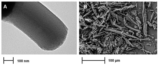 As previous research on silica nanoparticles as lubricant additives has mainly focused on spherical silica, we decided to investigate non-spherical silica nanoparticles in this work. We used SBA-15 (Santa Barbara No. 15) silica, modified with secondary amide compounds, as an additive with AW/EP properties. SBA-15 is a mesoporous silica with ordered internal channels (Figure 1A). The SBA-15 particle itself is spindle-shaped, with the size of its longitudinal dimension significantly exceeding that of its transverse dimension (Figure 1B). It has been successfully used as an adsorbent and catalyst support [,,,,,,], but not as a potential lubricant additive. Other similarly shaped, elongated nanomaterials, such as carbon nanotubes, have been successfully used in lubricants, resulting in improved tribological performance [,,,,,]. The mechanisms behind this improvement were reported to have a rolling effect and mending effect [].