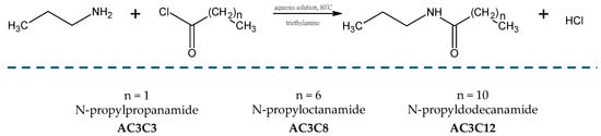 In the first stage of this research, three amide compounds were synthesized: N-propylpropanamide (AC3C3), N-propyloctanamide (AC3C8), and N-propyldodecanamide (AC3C12). The scheme of their synthesis is shown in Figure 2, and the procedures used are described in detail in Section 3.2. According to the Reaxys database, AC3C3, AC3C8, and AC3C12 compounds have not previously been studied as potential lubricant additives.