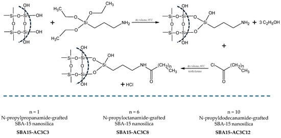 Scheme of the grafting of the amide compounds to SBA-15 silica nanoparticles.