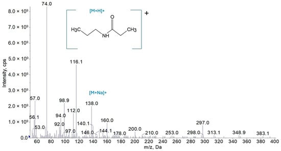 Based on this analysis, peaks were observed in AC3C3 (Figure 4) at m/z 116, corresponding to the molecular ion of the compound, and m/z 138, corresponding to its sodium adduct. Additionally, a well-ionizing peak at m/z 74, corresponding to the fragment [M − C3H6]+, was recorded.