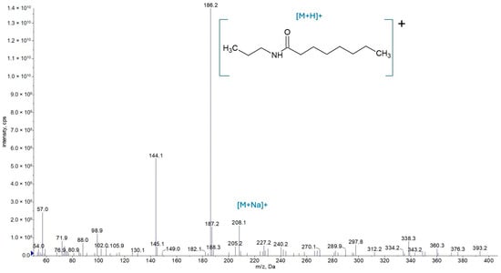Peaks were observed in AC3C8 (Figure 5) at m/z 186 Da [M + H]+, corresponding to the protonated pseudomolecular ion of the amide, 208 Da [M + Na]+, corresponding to its sodium adduct ion, and 144 Da, which is the fragmentation product of the 186 Da ion [M − C3H6]+.