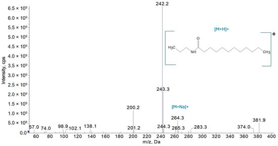 In the Q3 spectrum of AC3C12 (Figure 6), the most intense peaks were identified as being at m/z 242 (molecular ion of the amide) and m/z 264 (sodium adduct). Similarly to previous observations, a fragment peak resulting from the loss of the C3H6 group was also recorded at m/z 200.