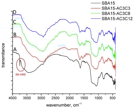 The wide band at 1000–1300 cm−1 is assigned to the asymmetric stretching vibrations of Si–O–Si bonds [], while the band at 780–800 cm−1 is assigned to symmetric stretching vibrations [] (Figure 7). The hydroxyl groups were observed as a wide band at 3000–3700 cm−1, and the narrow band at 3740 cm−1 corresponds to the isolated silanol groups Si–OH [] (Figure 7A). After grafting the amide structures onto the silica, the 3740 cm−1 band was significantly reduced (Figure 7B–D), which proves the presence of covalent bonding between the silica and organic structures. The presence of amide structures was observed through the band at 2850–2950 cm−1, which is assigned to methylene group stretching vibrations in the alkyl chain [,], and the band at 1640–1660 cm−1, which is assigned to vibrations of the –CO–NH– bond [].