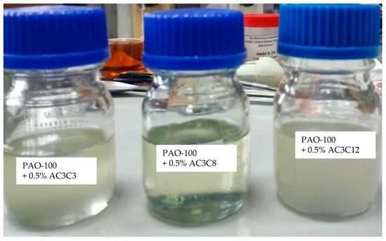 The results (Table 1, rows 1–4) show that the addition of a small amount (0.5%w/w) of free amides improves the anti-wear properties of the base oil, as evidenced by the decrease in wear diameter and increase in GOZ40. The smallest changes were observed for AC3C3 (Table 1, row 2) and the largest for AC3C8, where the GOZ40 was doubled. Furthermore, only this amide (AC3C8) retains its transparency in PAO-100 (Figure 8).
