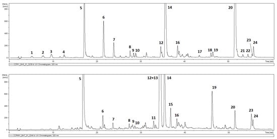 HPLC-UV chromatogram of Carpesium cernuum L. extracts (2 μL of 10 mg/mL extract injected) acquired at 325 nm: upper part—roots; lower part—aerial parts. Compounds: 1—caffeoylhexaric acid (I); 2—caffeoylhexaric acid (II); 3—caffeoylhexaric acid (III); 4—caffeoylhexaric acid (IV); 5—5-O-caffeoylquinic acid; 6—dicaffeoylhexaric acid (I); 7—dicaffeoylhexaric acid (II); 8—dicaffeoylhexaric acid (III); 9—unidentified phenolic acid derivative; 10—dicaffeoylhexaric acid (IV); 11—3;4-di-O-caffeoylquinic acid; 12—1;5-di-O-caffeoylquinic acid; 13—3;5-di-O-caffeoylquinic acid; 14—tricaffeoylhexaric acid (I); 15—4;5-di-O-caffeoylquinic acid; 16—tricaffeoylhexaric acid (II); 17—isobutyryl-dicaffeoylhexaric acid; 18—isobutyryl-tetracaffeoylhexaric acid; 19—tetracaffeoylhexaric acid; 20—isobutyryl-tricaffeoylhexaric acid (I); 21—isobutyryl-tricaffeoylhexaric acid (II); 22—isobutyryl-tricaffeoylhexaric acid (III); 23—2-methylbutyryl/isovaleryl-tricaffeoylhexaric acid (I); 24—2-methylbutyryl/isovaleryl-tricaffeoylhexaric acid (II).