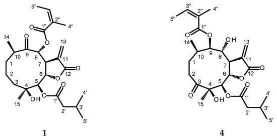 After the chromatographic separation of the chloroform extract from the aerial parts of C. cernuum, two previously undescribed sesquiterpene lactones, 8α-angeloyloxy-4β-hydroxy-5β-(3-methylbutyryloxy)-9-oxo-germacran-6α,12-olide (1) and 9β-angeloyloxy-4β,8α-dihydroxy-5β-(3-methylbutyryloxy)-3-oxo-germacran-6α,12-olide (4), together with six known terpenoids (4β-hydroxy-5β-isobutyryloxy-8α-(3-methylbutyryloxy)-9-oxo-germacran-6α,12-olide (2) [29,30], 4β,8α-dihydroxy-5β-isobutyryloxy-9β-(3-methylbutyryloxy)-3-oxo-germacran-7β,12-olide (3) [31], divarolide E (5) [32], incaspitolide D (7) [29,31,33], 5β-angeloyloxy-4β,8α-dihydroxy-9β-isobutyryloxy-3-oxo-germacran-7β,12-olide (8) [34], and loliolide (6) [35]) were identified. The structures of the new compounds (1 and 4, see Figure 2) were deduced based on the analysis of their spectral data (HRESIMS, 1D- and 2D-NMR experiments, and specific rotation measurements).