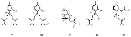 Thymol derivatives are common constituents of plants from some tribes of Asteraceae, including Inuleae and Eupatorieae. Their biological activity and their molecular mechanisms of action have aroused some interest in recent years. 8-Hydroxy-9,10-diisobutyryloxythymol (9) from Inula wissmanniana has demonstrated moderate anti-inflammatory activity in LPS-induced RAW 264.7 macrophages [37]. The same compound, isolated from Inula helianthusaquatilis C.Y.Wu ex Ling, turned out to be an inhibitor of MDM2-p53 (E3 ubiquitin-protein ligase Mdm2/protein p53) interactions [48]. A search for kinase-inhibiting compounds, which started from 2576 candidate plant extracts, found that 10-isobutyryloxy-8,9-epoxythymyl isobutyrate (13) from Arnica montana L. is the most active out of all the tested compounds. Compounds 13 and 9 (the possible degradation product of 13) inhibited aberrant proliferative signaling in melanoma cells via the MAPK/ERK and PI3K/Akt pathways [49]. Moreover, compound 13 from Inula nervosa Wall. demonstrated a protective effect in an experimental model of hepatic steatosis [50], in part through the activation of the nuclear factor erythroid 2-related factor 2/antioxidant response element (Nrf2-ARE) signaling pathway.