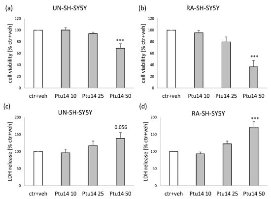 The impact of 9 (Ptu 14) on UN- (a,c) and RA-SH-SY5Y (b,d) cell survival after 24 h of treatment. The data from the cell viability MTT reduction assay (a,b) were normalized to the control (vehicle-treated cells) and are presented as the mean ± SEM from 4–8 independent experiments with 3–5 replicates. Cytotoxicity was measured using the LDH release assay (c,d) and the data were normalized to the control (vehicle-treated cells) and shown as the mean ± SEM from 4–9 independent experiments with 3–5 replicates. *** p < 0.001 vs. vehicle-treated cells.