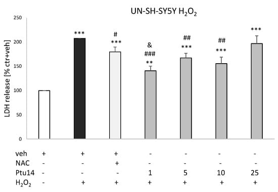 The protective effects of 9 (Ptu14, 1–25 μM) against hydrogen peroxide (H2O2)-induced cell damage in UN-SH-SY5Y cells measured by the LDH release assay. N-acetyl-cysteine (NAC, 1 mM) was used as the positive control. The data were normalized to the control (vehicle-treated cells) and are presented as the mean ± SEM from 3–5 independent experiments with 3–5 replicates. ** p < 0.01 and *** p < 0.001 vs. the vehicle-treated cells; # p < 0.05, ## p < 0.01, and ### p < 0.001 vs. the H2O2-treated cells; and & p < 0.05 vs. the NAC + veh + H2O2-treated cells.