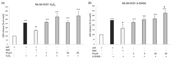 The effect of 9 (Ptu 14; 1–25 μM) on RA-SH-SY5Y cells treated with either H2O2 (a) or 6-hydroxydopamine (b). Cell damage effects were measured using the LDH assay. N-acetyl-cysteine (NAC, 1 mM) was used as the positive control. The data were normalized to the control (vehicle-treated cells) and are presented as the mean ± SEM from 4–6 independent experiments with 3–5 replicates. * p < 0.05, *** p < 0.001 vs. the vehicle-treated cells; # p < 0.05 vs. the H2O2/6-OHDA-treated cells.