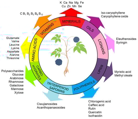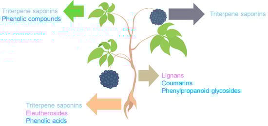 ES constitutes a complex matrix, and the following groups of compounds can be distinguished: volatile compounds (essential oils), lignans, triterpenoid saponins, coumarins, flavones, carbohydrates and polysaccharides, vitamins, amino acids, lipids, and minerals (Figure 1). They occur unevenly in different parts of the plant (Figure 2). For example, triterpene saponins are the main components of leaves, fruits, shoots, and roots [28]. In contrast, stems are rich in lignans, coumarins, and phenylpropanoid glycosides [29]. Phenolic acids are more abundant in the leaves than in the stems [28]. Many of the ES components are biologically active, such as eleutherosides, isofraxidin, syringin, lignans, chiisanoside, acanthoside, senticoside, β-sitosterol, sesamine, and savinine [21,30,31].