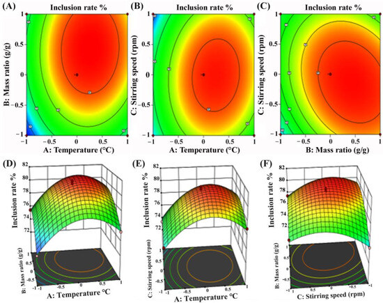 Contour and response surface plots illustrating interaction effects of process parameters on inclusion efficiency of stilbene/HP-β-CD inclusion complex: (A,D) interaction between inclusion temperature (A) and mass ratio of CCMLE to HP-β-CD (B) at fixed stirring speed; (B,E) interaction between inclusion temperature (A) and stirring speed (C) at fixed mass ratio; (C,F) interaction between mass ratio (B) and stirring speed (C) at fixed inclusion temperature.