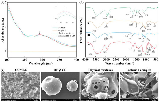 Characterization of stilbene/HP-β-CD inclusion complex. (a) UV absorption spectra of Cajanus cajan (L.) Millsp. leaf extract (CCMLE), HP-β-CD, physical mixtures of CCMLE and HP-β-CD, and stilbene/HP-β-CD inclusion complex; (b) FTIR spectra of (i) CCMLE, (ii) HP-β-CD, (iii) physical mixtures and (iv) stilbene/HP-β-CD inclusion complex; (c) scanning electron microscope (SEM) images of CCMLE, HP-β-CD, physical mixtures and stilbene/HP-β-CD inclusion complex.