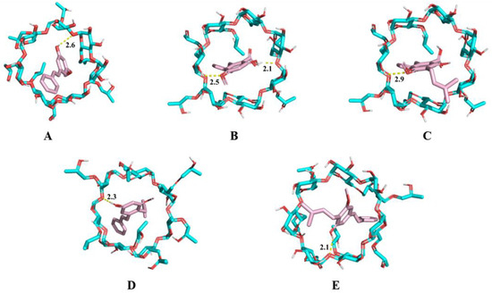 Molecular docking diagram of 2-hydroxypropyl-β-cyclodextrin (HP-β-CD) and pinosylvin monomethyl ether (PME) (A), 4-O-methylpinosylvic acid (MPA) (B), cajaninstilbene acid (CSA) (C), longistyle C (LLC) (D) and longistyle A (LLA) (E). Blue represents the structure of HP-β-CD, while pink represents stilbenes. The dotted line represents the hydrogen bond interaction formed by the two molecules.