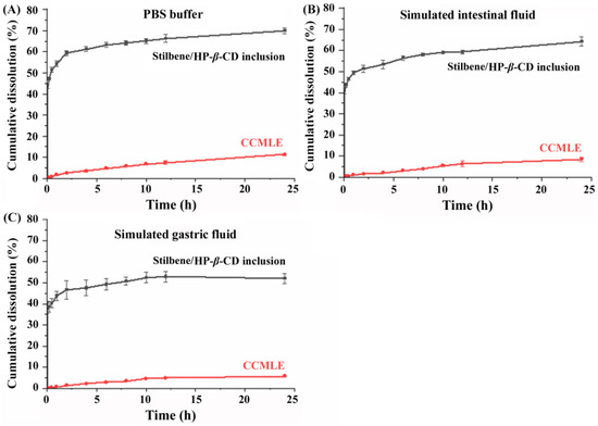 The inclusion of the stilbenes in HP-β-CD significantly improved their dissolution rate compared to their presence in CCMLE alone. After 24 h, the cumulative release of stilbenes from the stilbene/HP-β-CD inclusion complex was 70% in PBS, 64% in SIF and 52% in SGF. In contrast, the dissolution rate of stilbenes from CCMLE was significantly slower (below 10%) in all the conditions tested. This improvement in both the rate and extent of dissolution suggested that the inclusion complex effectively enhanced the aqueous dispersion and release profile of the stilbenes, probably due to the increased wettability and improved dispersion afforded by the hydrophilic outer surface of HP-β-CD. In addition, the encapsulation may have maintained a dynamic equilibrium in which changes in the surrounding medium promoted the gradual release of free stilbene molecules [46].
